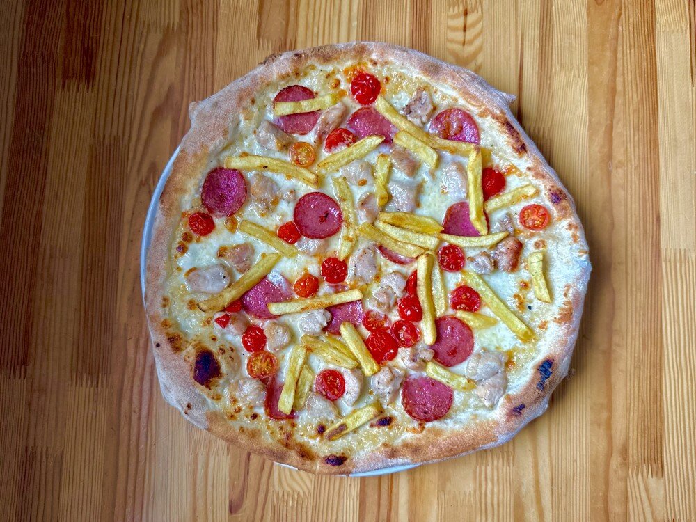 Сыр Моцарелла, курица, черри, картофель фри, салями, соус луковый